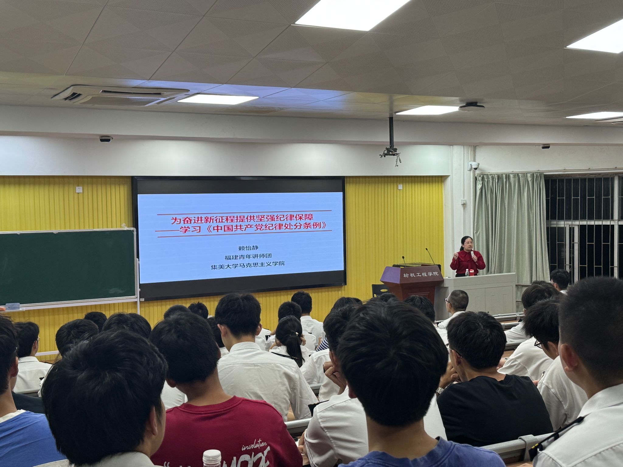 讲座中,赖怡静教师以《为奋进新征程提供坚强纪律保障——学习<中国共产党纪律处分条例>》为题,深入解析了《中国共产党纪律处分条例》的核心要义和实践要求,并强调纪律建设在党的自我革命中的重要性,以及在新时代背景下,如何通过强化纪律来确保党的先进性和纯洁性。