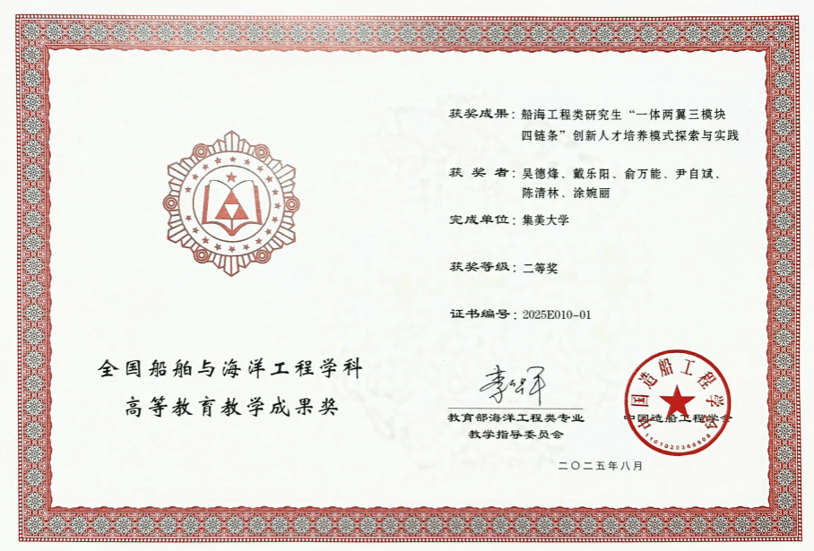 近日,教育部海洋工程类专业教学指导委员会和中国造船工程学会公布了全国船舶与海洋工程学科高等教育教学成果奖评选结果。我校轮机工程学院申报的《船海工程类研究生“一体两翼三模块四链条”创新人才培养模式探索与实践》(完成人:吴德烽,戴乐阳,俞万能,尹自斌,陈清林,涂婉丽)喜获教学成果二等奖。