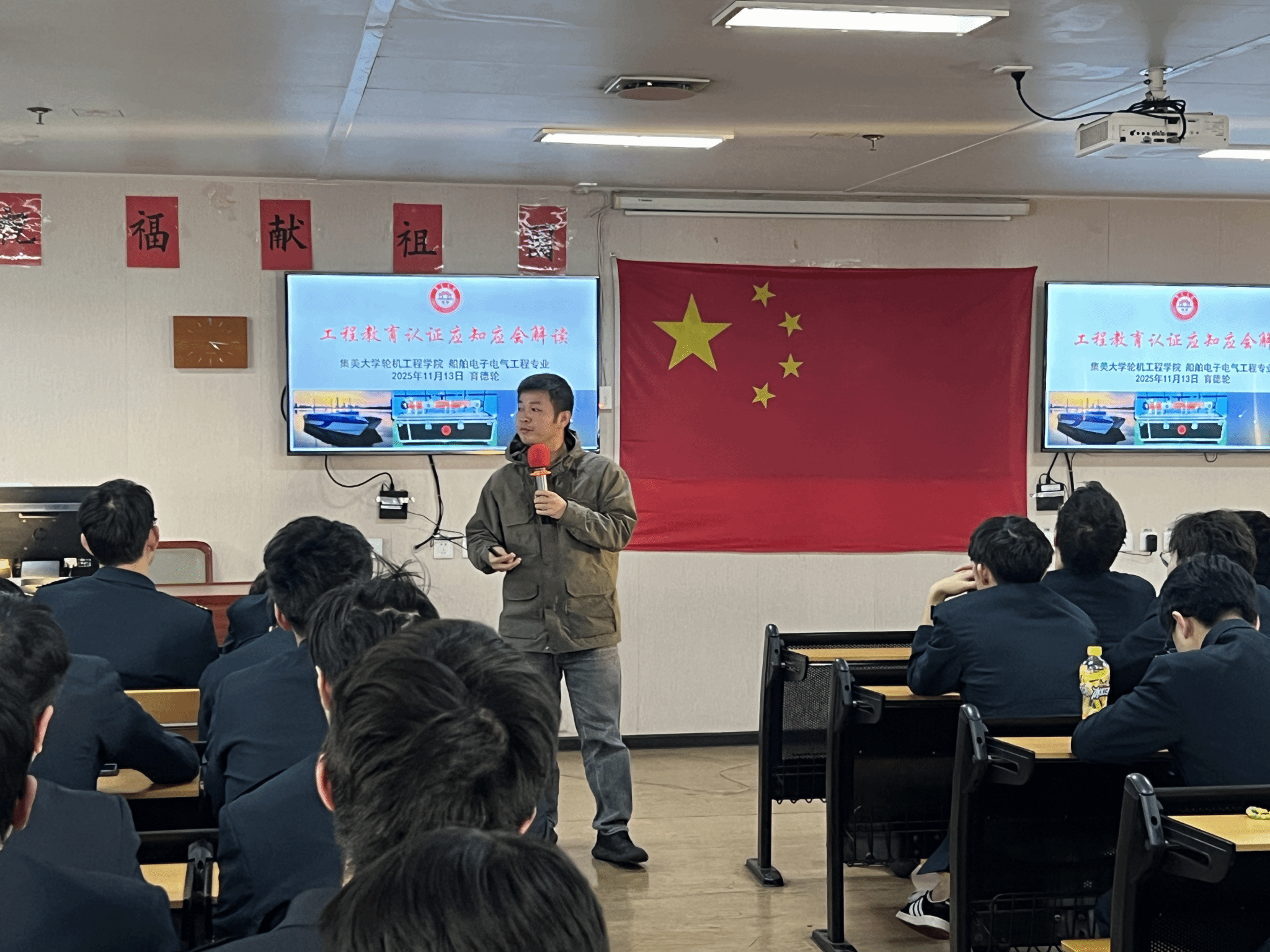 在课上,钟尚坤老师阐述了工程教育认证对学生就业、注册工程师资格获取及跨国从业的重要意义,指出其遵循“以学生为中心、以产出为导向、持续改进”的理念,通过闭环质量保障机制持续优化培养过程,并介绍了认证专家考查学生能力的方式。在专题讲解中,钟尚坤老师解读了船舶电子电气工程专业的培养方案,其核心是涵养诚毅品格、激发创新精神、提升国际竞争力,旨在培养掌握关键技术、具备故障处理能力并熟悉国际规则的高级应用型人才。