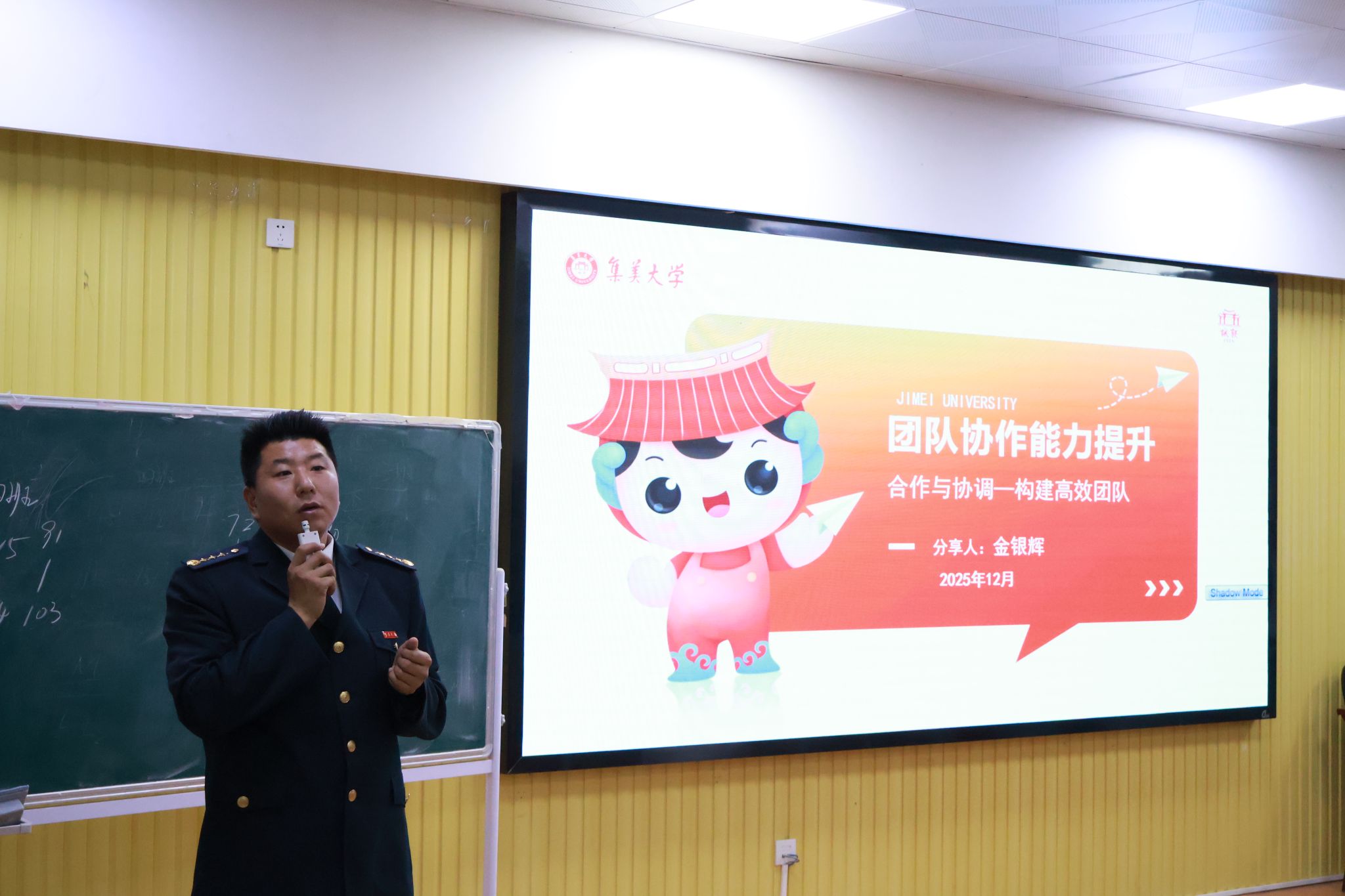 首次课程由辅导员金银辉主讲,围绕“团队协作能力提升”主题,以期培养学生干部的合作精神和协调能力,促进团队和谐与目标达成。