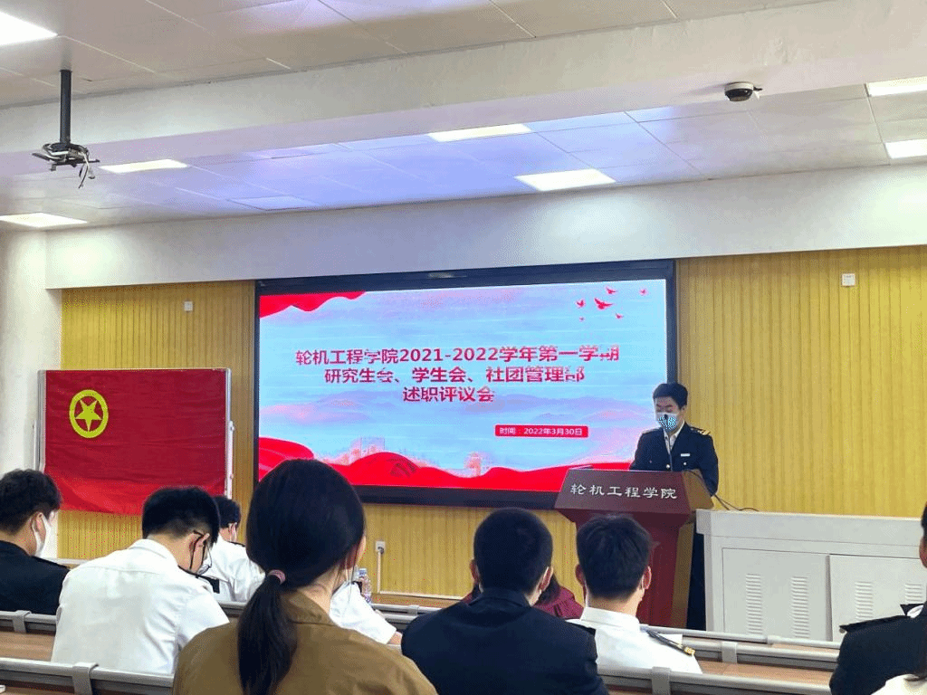 深入贯彻落实团中央、团省委关于学生会组织深化改革的要求,推进完善学生组织述职评议制度,3月30日下午,轮机工程学院团委在育志楼227召开2021-2022学年第一学期学生组织和社团述职评议会。院党委副书记赖龙荣、院团委副书记、辅导员、学生组织和社团干部、干事代表参加了此次会议。会议由院学生会主席团成员万宝龙主持。