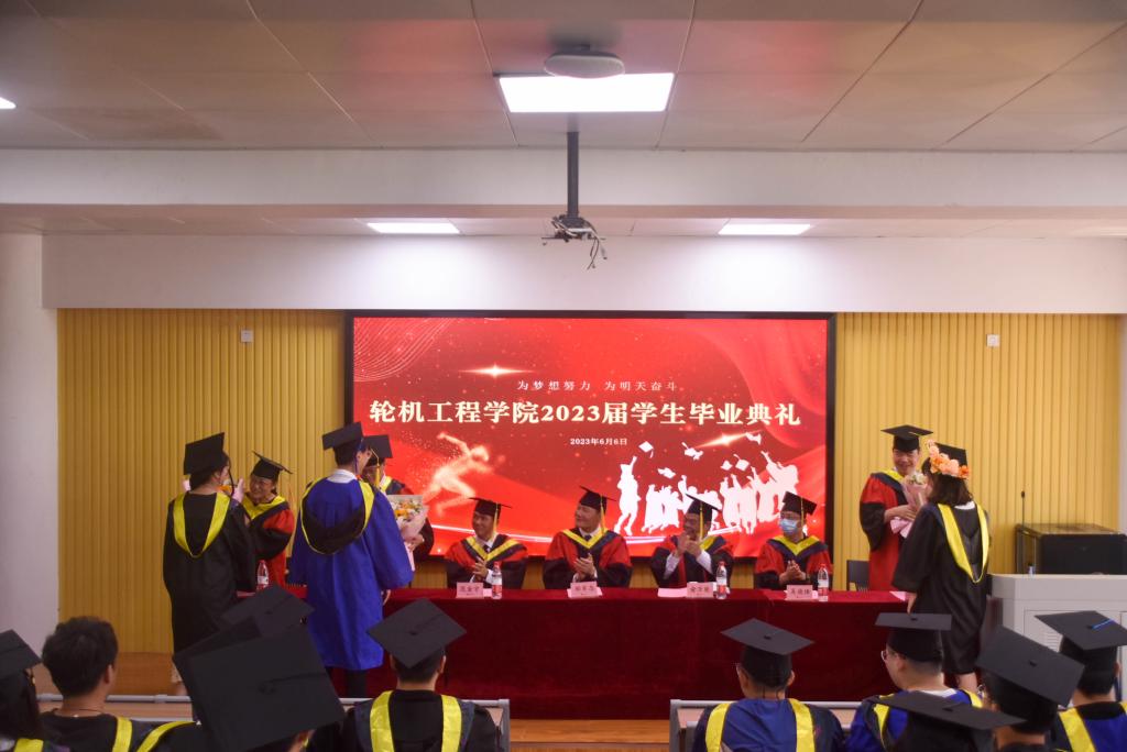 学生毕业典礼在国歌声中拉开帷幕,副院长范金宇宣读轮机工程学院拟毕业情况,院领导、教师代表为2023届毕业生代表颁发毕业证书,为优秀毕业生代表颁发荣誉证书。毕业生代表向教师代表香献花,感谢老师们的辛苦付出。