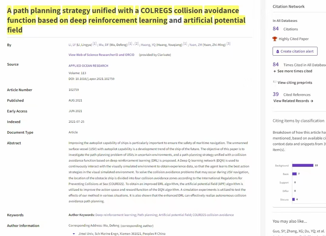 近日,据最新公布的ESI(Essential Science Indicators,基本科学指标数据库)高被引阈值,轮机工程学院吴德烽教授团队发表在《AppliedOceanResearch》(IF:4.3, JCR Q1)的论文“A path planning strategy unified with a COLREGS collision avoidance function based on deep reinforcement learning and artificial potential field ”入选ESI高被引论文,集美大学轮机工程学院为论文第一署名单位和通讯单位,轮机工程学院2019级硕士生李凌宇为论文第一作者,吴德烽教授为通讯作者。