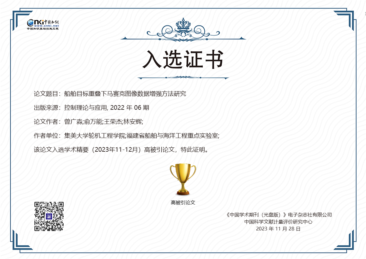 我院师生共同撰写的“船舶目标重叠下马赛克图像数据增强方法研究”一文荣登高被引论文之列。论文发表于《控制理论与应用》2022年06期,主要完成人包括:曾广淼(第一作者,我院2020级博士研究生)、俞万能教授(指导教师)、王荣杰教授(通讯作者、指导教师)和林安辉博士。论文针对海面目标识别领域的目标重叠遮挡难题,提出了多通道马赛克数据增强的创新性方法,该方法通过多图像的裁剪与融合来提升目标与背景间的交互性,进而实现目标重叠遮挡下海面目标的准确识别。研究结果在海上交通安全、海上搜救和国防安全等领域具有很好的实际应用价值。