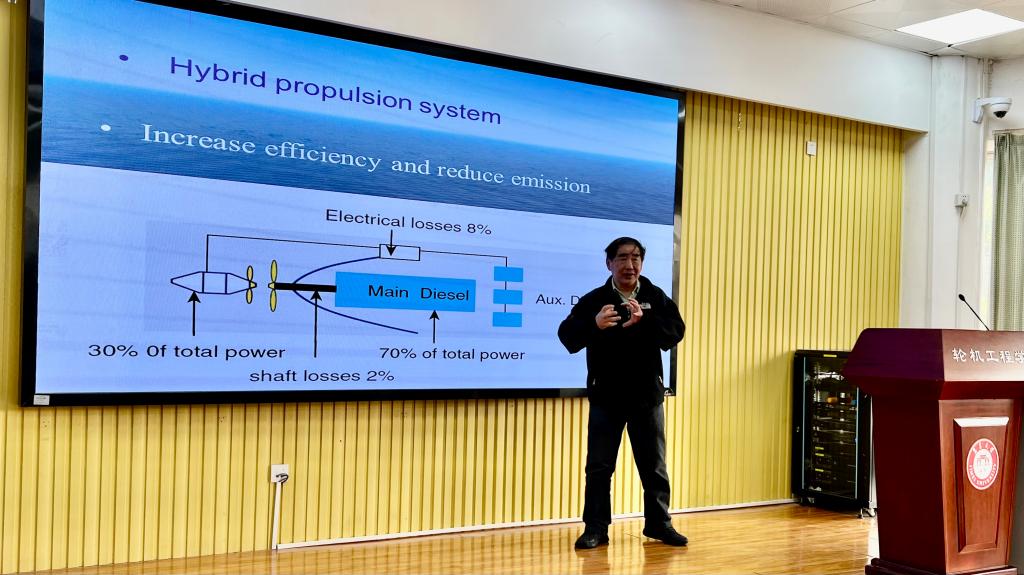 2024年1月2日下午,上海海事大学汤天浩教授应邀到我院指导工作,并做题为“双碳目标的绿色船舶发展之路与思考”的专题报告。报告由吴德烽副院长主持,学院船电教研室,电气自动化教研室等相关老师和研究生、本科生参加了专题报告会。