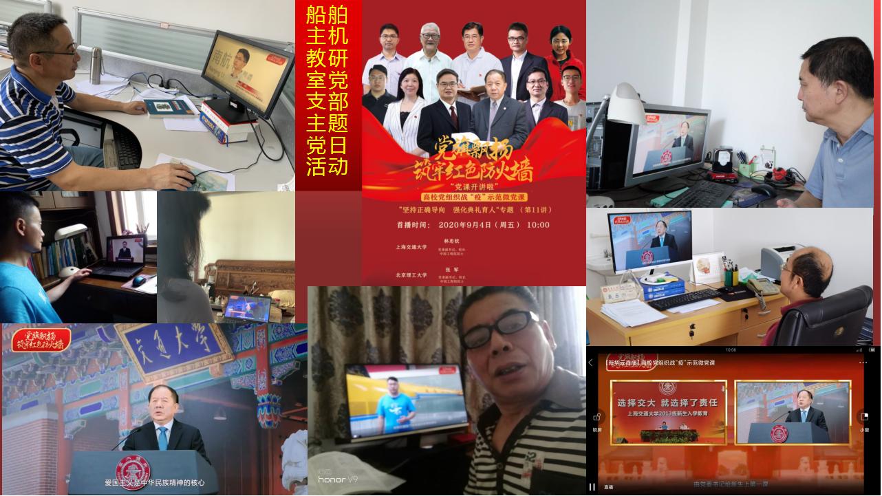 2020年9月4日,船舶主机教研室党支部结合高校党组织战“疫”示范微党课第11讲——“坚持正确导向 强化典礼育人”专题开展主题党日活动,各位党员同志在工作之余抽出时间在电子屏幕前认真学习。在此次党课中,来自上海交通大学、北京理工大学、中国农业大学、南京航空航天学院等4所高校的书记 、校长、教师党员、学生党员、毕业生代表讲述了各高校典礼育人成效。各位党员认为只有始终坚持正确舆论导向,牢固树立责任感和使命感,充分发挥教书育人、管理育人、服务育人的功能,强化竞争意识和阵地意识,积极应对各种机遇和挑战,是对新时期高校党员教师的必然要求。