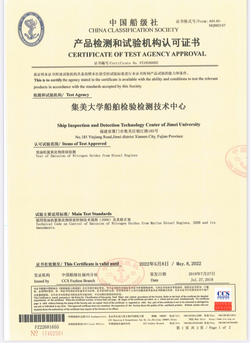 (4)提供船用柴油机厂新生产柴油机CCS排放认证。