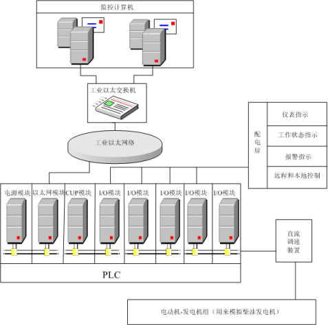 船舶电站作为船舶的心脏,是船舶设备中必不可少的重要组成部分。本电站仿真平台的硬件主要包括电动机-发电机组、配电板、监控计算机、工业以太网交换机、可编程控制器(PLC)等硬件部分。软件部分主要包括用于自动控制的PLC控制程序、用于远程管理的监控管理软件和用于人机交互的可视化软件。通过管理层、应用层和设备层之间的相互通信和协调运作,实现对船舶电站的高度模拟与仿真,研究管控一体化的电站系统。