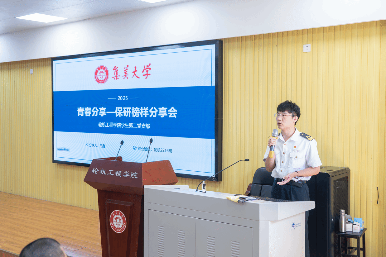 2025年9月28日,集美大学轮机工程学院学生第二党支部于育志楼227教室举办“逐梦科研路,保研经验谈”青春分享会。活动邀请成功保研至重庆大学能源与动力专业的大四学生王鑫担任主讲,为在场学子传授保研经验,以实际行动迎接国庆佳节。